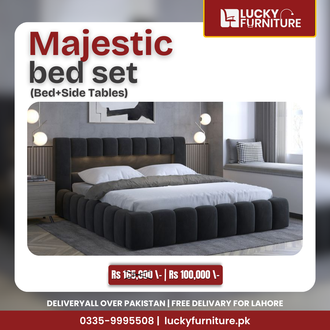 The Majestic Bed Set adds grandeur and comfort to your bedroom with its sophisticated design and functional side tables.